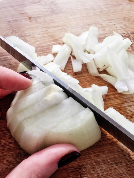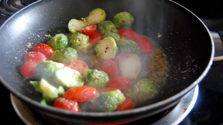 Heat a medium fry pan on the highest heat for a few minutes, then add a bit of oil. Add chopped vegetables, a small splash of water and cover the pan with a lid (this will create a mini steaming effect). Cook for 4-5 minutes until veggies are tender.