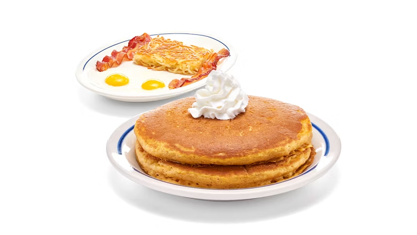 IHOP has successfully turned a basic breakfast food into the most unique set of menu items, one of which includes its pumpkin spice pancake combo. This order has two large and fluffy pumpkin spice pancakes topped with fresh whipped cream, two pieces of bacon, two sausage links, two eggs, and two hashbrowns. Additionally, you can add more pumpkin flavor with the pumpkin spice cold foam cold brew.