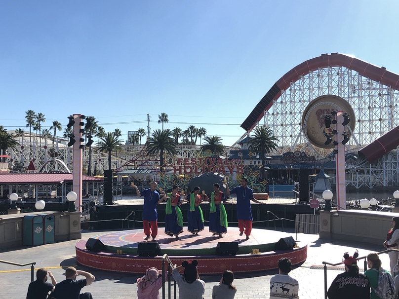 Yes, the festival, which happens at Disney’s California Adventure Park through January 8, 2019, is partly a Christmas party. It’s also a food and entertainment festival that celebrates Navidad, Hanukkah, Kwanzaa, Three Kings Day and Diwali. For every pop-up performance of that Nutcracker drum line (they’re really called the Holiday Toy Drummers), there’s another of Blue13 (pictured above), performing traditional Diwali dances. There’s a holiday marketplace with local California makers, and Santa ready to take many, many photos that will end up all over the country at Christmas cards. There’s even real snow by Grizzly Peak, where there’s an enormous bear wearing an illuminated ugly Christmas sweater.