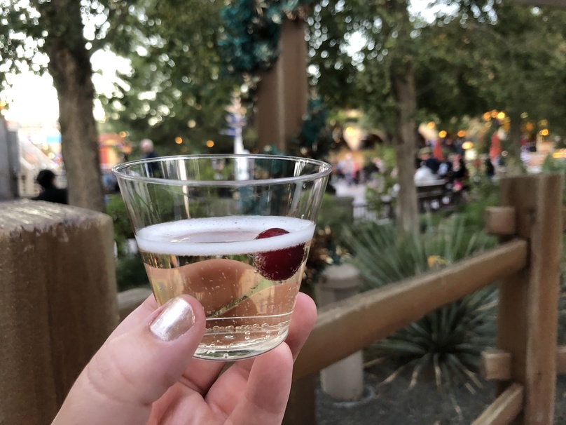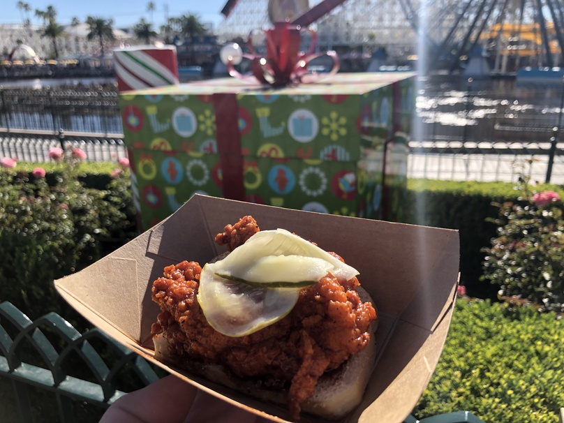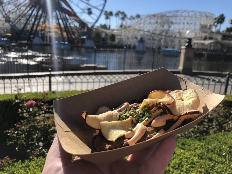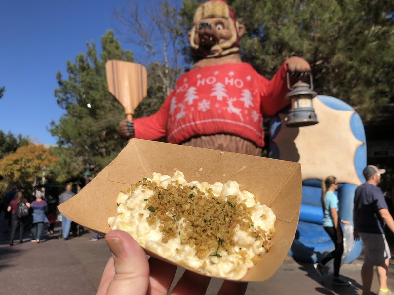 Disneyland’s Festival of the Holidays is similar to other food events in the park, in that there are pop-up food kiosks serving food that isn’t available anywhere else, and only for the duration of the festival. While the festival incorporates Disney-fied versions of many multicultural holiday foods, a lot of it is based on traditional American holiday foods – namely, turkey and stuffing. The macaroni and cheese pictured above is Holiday Stuffing Mac and Cheese, which was really just herbed bread crumbs on top of garlic mac. It was much better than I expected it to be from the name.