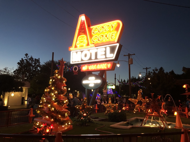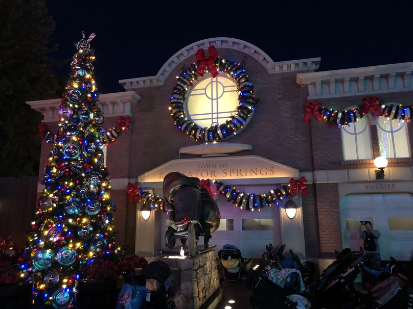 Just like at Halloween, Disneyland gets a super festive makeover for Christmas. A lot of the holiday warm and fuzzies are across the plaza in Disneyland Park, like Sleeping Beauty’s Castle draped with snow and Christmas ornaments, but one of the most magical places for Disney Christmas is in California Adventure: Cars Land. Cars Land Christmas includes animatronic cars from the movie who are celebrating the holiday – Mater becomes Santa Mater – and decorations made from spare tires, traffic cones and car parts. Even for someone who’s never really warmed to that movie, it’s very cute.