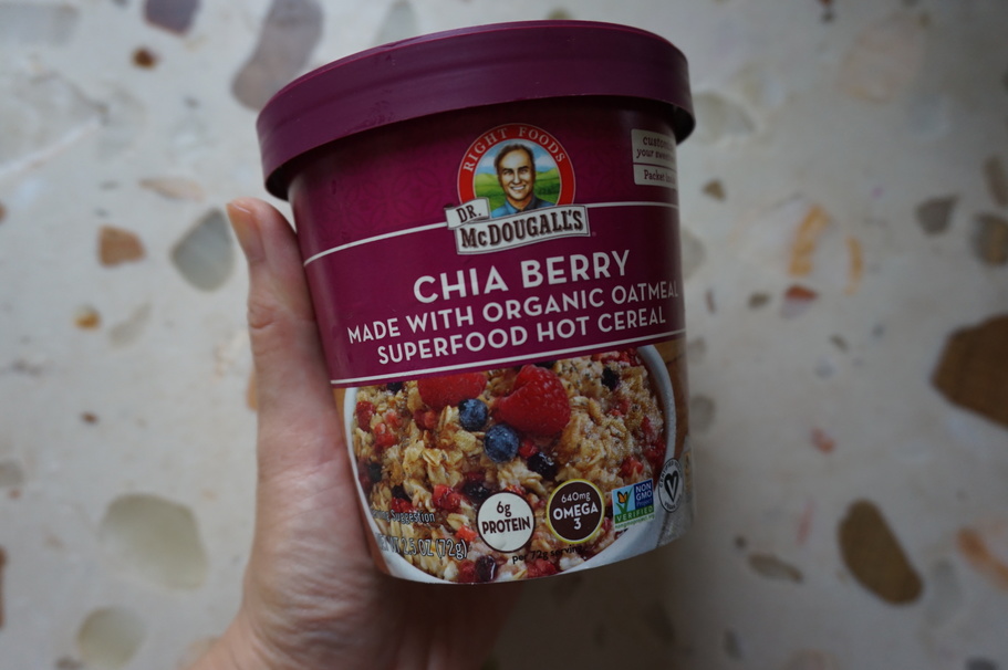 My favorite is the Right Foods super food oatmeal. They come in a number of different flavors, and the sugar is in a separate sachet so you can personalize the level of sweetness or use your own sweetener. If you buy the one in a paper cup, you can soak the contents in the cup and simply add toppings in the morning and take it to-go.