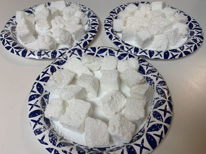 Cutting the marshmallows was the hardest part. The recipe recommends giving your knife a water bath between each cut, and I endorse that tip. I dusted my paper plates with powdered sugar since my marshmallows were sticking to everything. They stuck to my pan, they stuck to my knife, and they stuck to my hands. Nonetheless, I corralled all of them onto plates and dusted them liberally with powdered sugar.