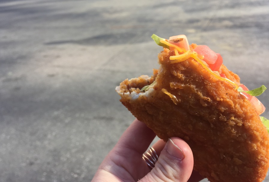 I took a bite and gave an audible “OMG.” Wow. This is unlike any Taco Bell item I’ve ever had. The chicken shell is perfectly crispy and the batter that it’s fried in has a slight kick to it. The taco is filled with a layer of avocado ranch sauce, lettuce, diced tomatoes, and cheddar cheese.
