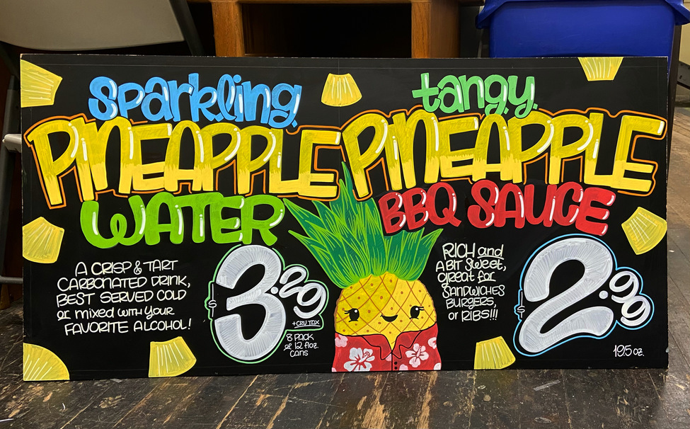 To start the process, Nguyen and other artists measure the correct size board for display and clearly label the margins to ensure none of their careful drawing gets cut off. Next comes the sketch of the key information detailed in the info sheets. Nguyen uses a white POSCA paint marker for the initial sketch of the board. “I usually like filling out and outlining my words and prices with white because once I’m done with that, I layer it over with colors that are kind of cohesive to the product, and it makes it stand out so much more,” she said.