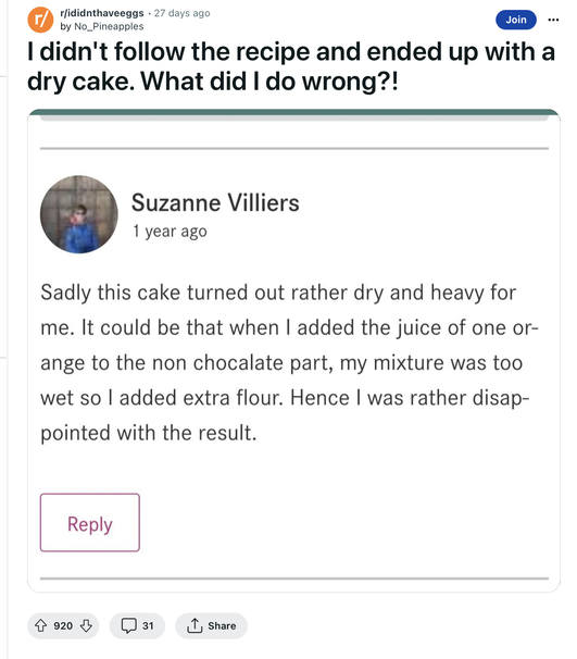 If you learn anything today, it’s that whenever you’re using an online recipe, check the comment section. It might just give you the will to live as these five I Didn’t Have Eggs posts did for me.