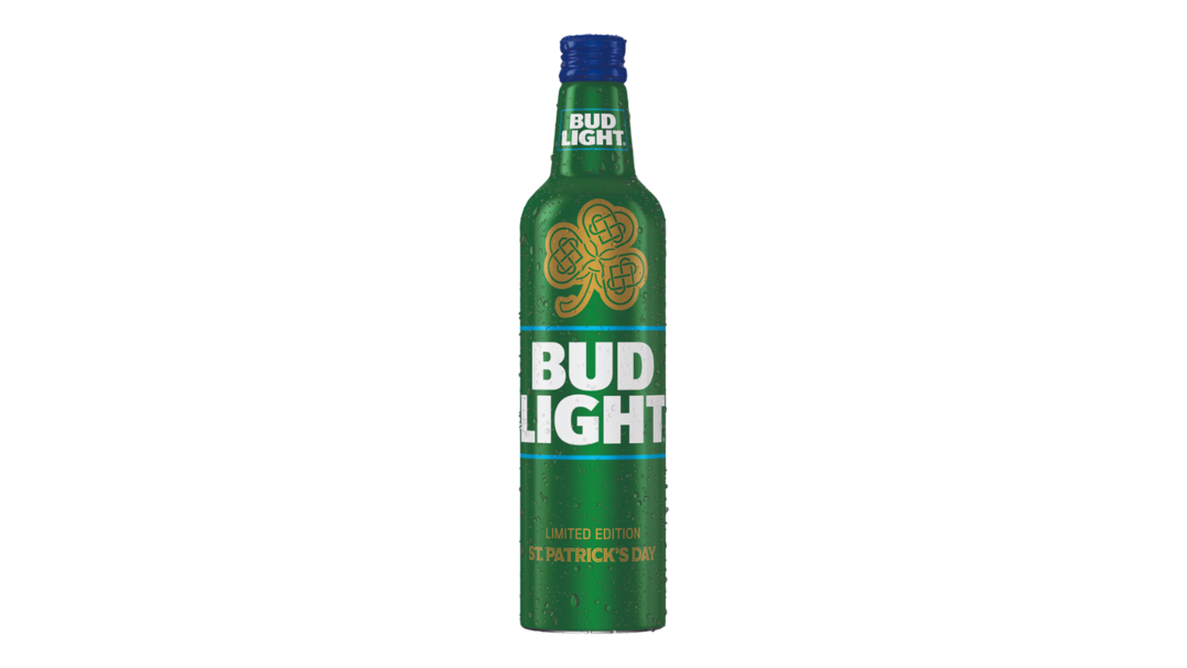 The words “Bud Light” are written in white on the bottle. At the top, there’s a four-leaf clover in a rich golden hue that makes the bottle look even cooler. This new design is sure to catch the eye of beer lovers and collectors alike.