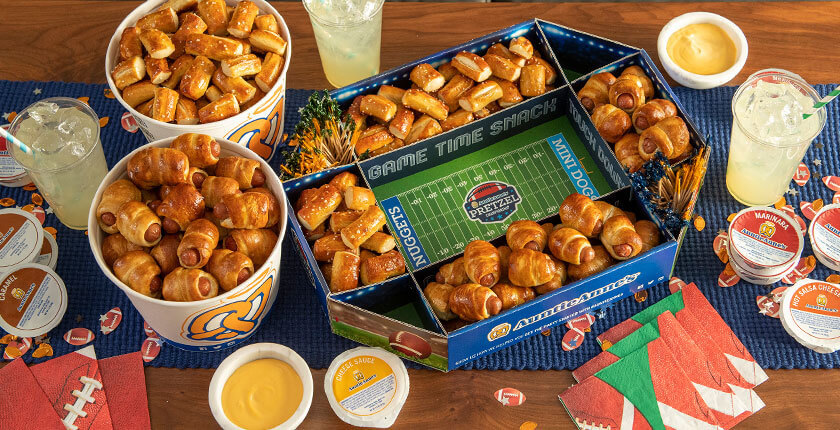 If you’re hosting a large party and looking for some visual prestige, the Snack Stadium is for you. It contains two buckets with any pretzel nuggets and six dips on a platter that looks like a football stadium. And on Super Bowl Sunday, you can get it delivered for free.