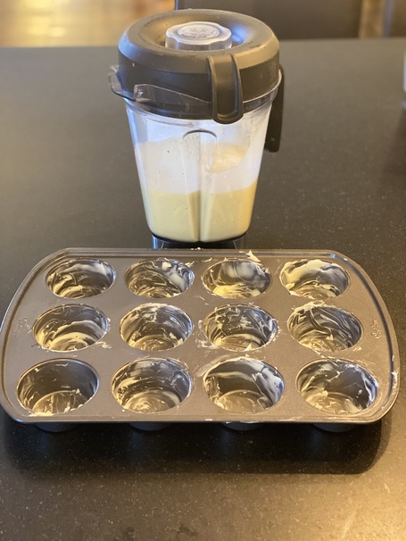 Pour the egg mixture evenly into the muffin tin cups. Sprinkle the bacon evenly over the egg mixture in the muffin tin and mix some of it into the egg mixture to distribute it throughout the muffin cup.