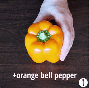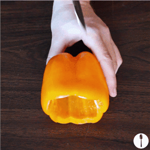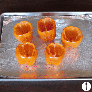 Cut out orange pepper tops and clean out the insides of seeds and veins.