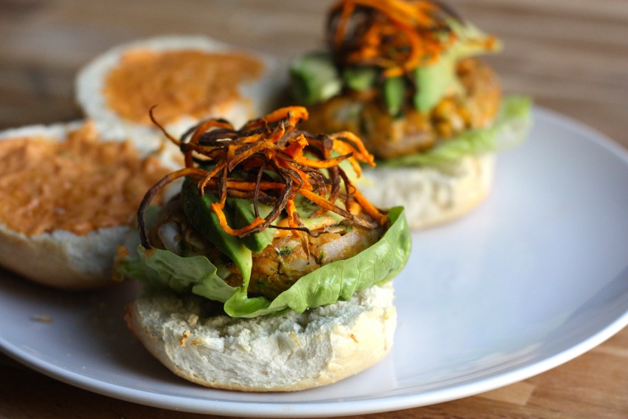 Sometimes nothing but a nice juicy burger will do. Get the recipe for these spiced chickpea burgers and dress it up with Sriracha mayo.