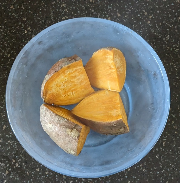 Next, I tried cooking a sweet potato. This was super easy, I just chopped it into a couple big pieces, dumped it in the dish with the vent lifted, and stuck it in the microwave for 9 minutes.