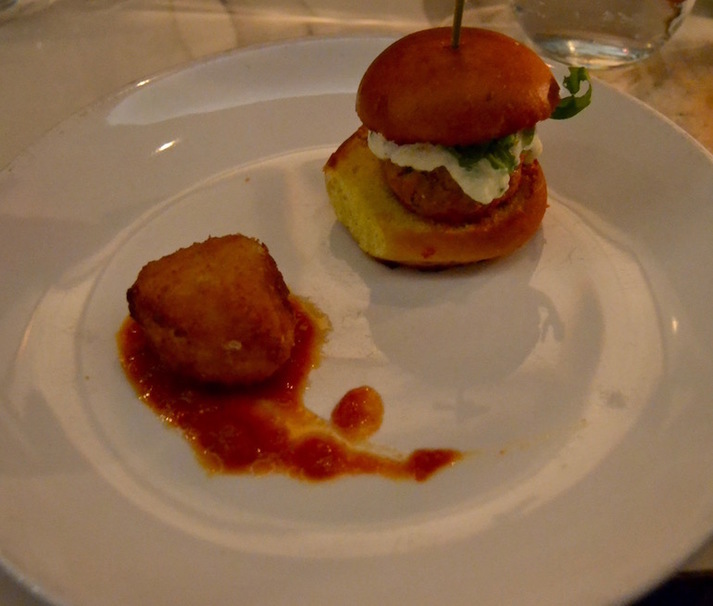 The Truffle Rice Ball and Adoro Slider came next. The rice ball tasted surprisingly complex for what it was (a cheesy ball of rice). The exterior was crisp, and the interior fell apart in your mouth in one cheesy, gooey ball—simply amazing. The Adoro Slider featured a veal and pork meatball that was spiced just enough, but not too much. I could still taste the meat itself, which was divine with the creamy ricotta on the toasted bun.