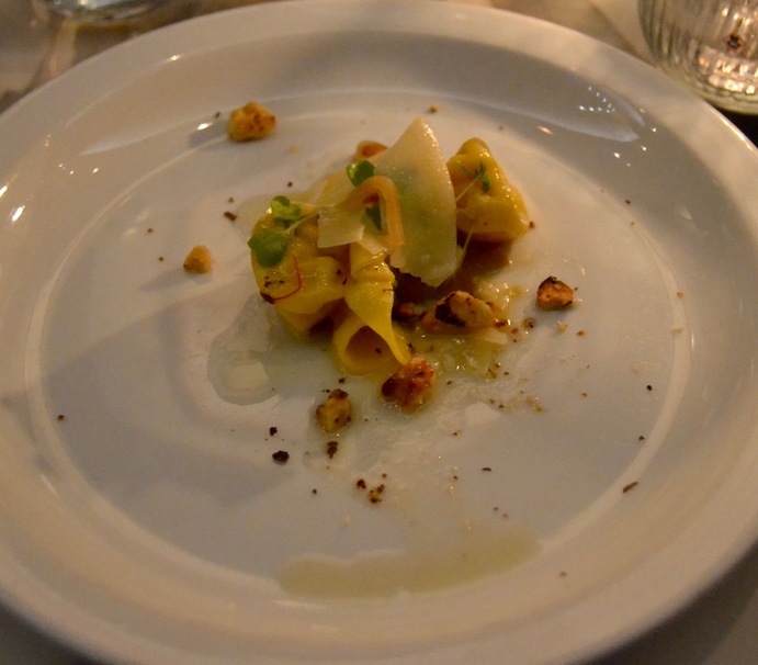 The next course featured the Pasta Purses, which were filled with cheese, pear, and a brown butter sage sauce. The sweetness of the filling contrasted nicely with the earthy walnut chunks on the plate, and it made me sad I wasn’t allowed to lick the plate.