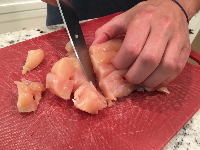 In the same saucepan that you used for the broccoli, add 4 cubed chicken breasts. Cook them for about 10 minutes on medium-high heat, or until they are almost fully cooked. Bring down the heat to medium and add salt and pepper to taste.