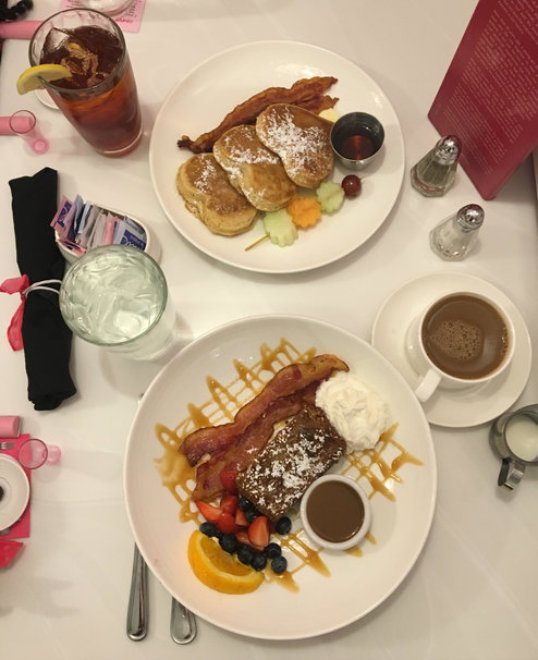 The main course arrived pretty quickly after, right while we were discussing our favorite memories from our last family vacations. We each got a breakfast staple: french toast and pancakes. Super fluffy and topped with powdered sugar, we couldn’t get enough of every bite. Though, before we dug in, we had to take some pictures, because brunch.