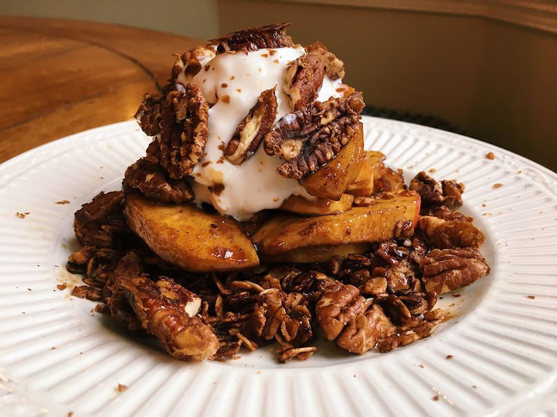 Pick up your fork for a flavorful bite of melting Greek yogurt, warm caramelized apples, crunchy maple roasted pecans, and cinnamon oats. What a sensational experience.
