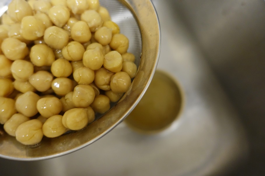 Drain the garbanzo beans, making sure to keep the separated liquid. Set aside.