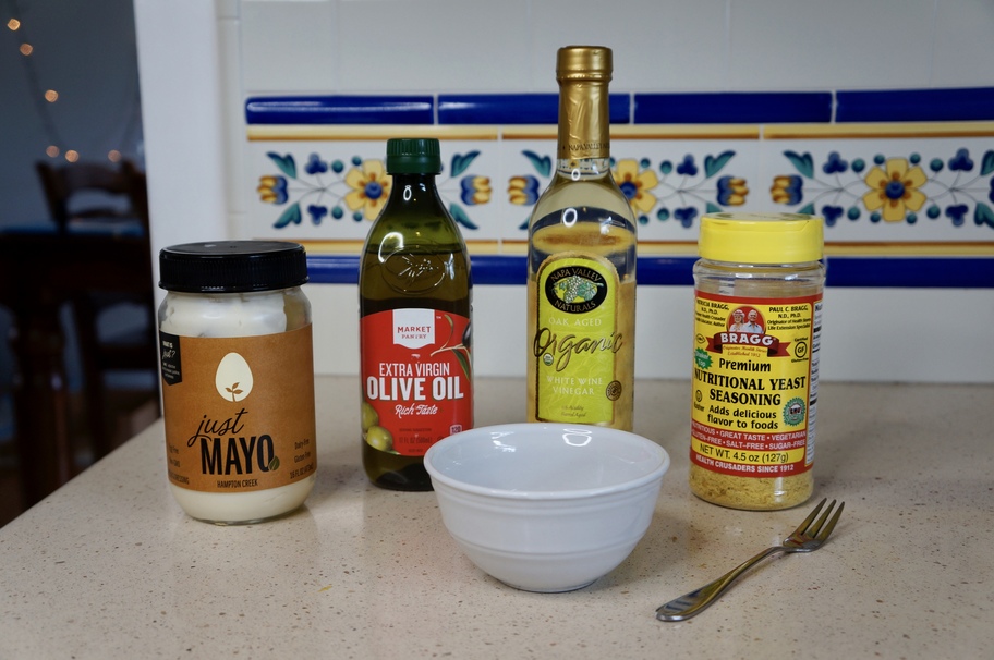 In a small bowl, I start with the olive oil, about three tablespoons for a medium salad. This darling of the Mediterranean diet has all the healthy fats your heart desires. Then I add equal parts white balsamic vinegar for that bite of acidity (it has to be balsamic, it won’t mix right otherwise). For the creaminess, I lop in a tablespoon of vegan mayo and start whisking. While that would be good on its own, the pièce de résistance is a tablespoon of nutritional yeast, (or Nooch as my friends and I call it). Nutritional yeast is a must-have for vegans since it can be sprinkled on anything to give it a mild cheesy flavor, and it’s high in Vitamin B-12, an important vitamin rarely found in the plant kingdom. You can find it at most health food stores in the bulk or seasoning section. From there, it’s up to personal preference how you want to season your dressing, but a dash of salt and pepper is a safe bet if you haven’t ventured far into your spice cabinet.
