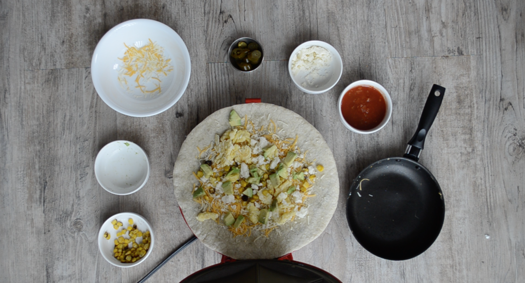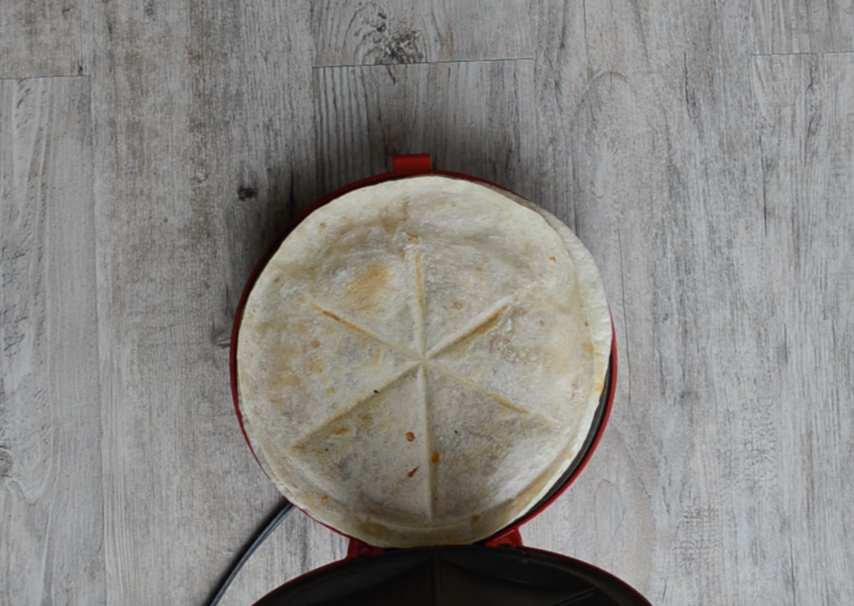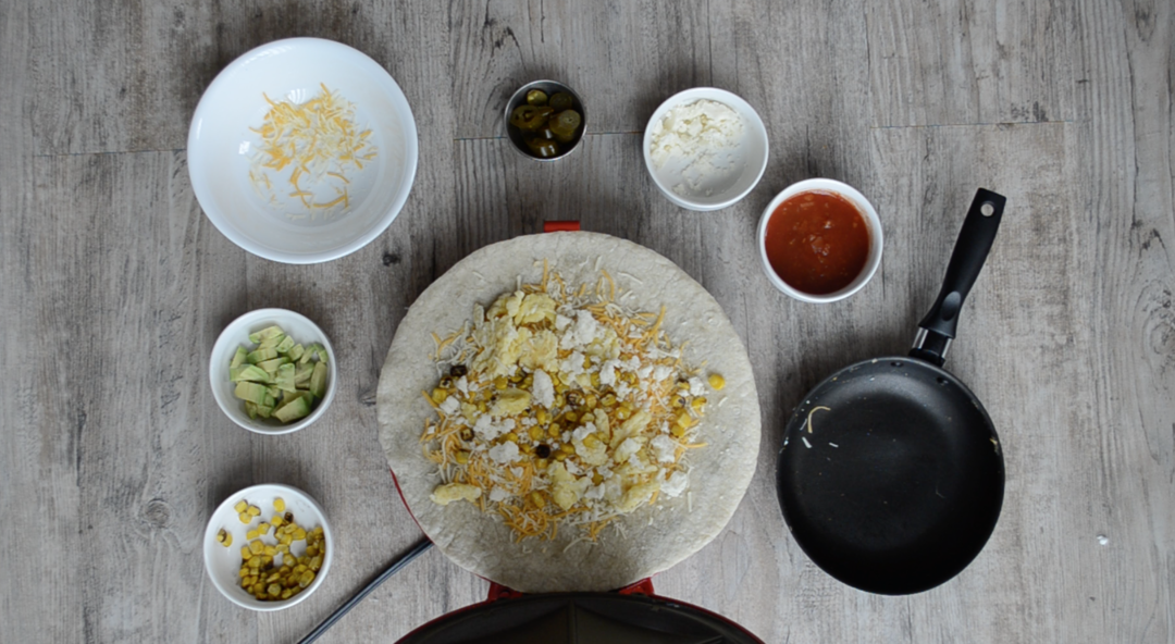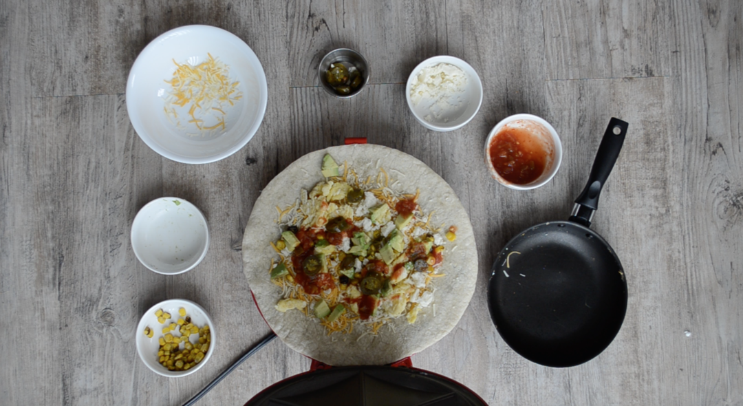 Heat up tortilla press and first put down 1 large flour tortilla.