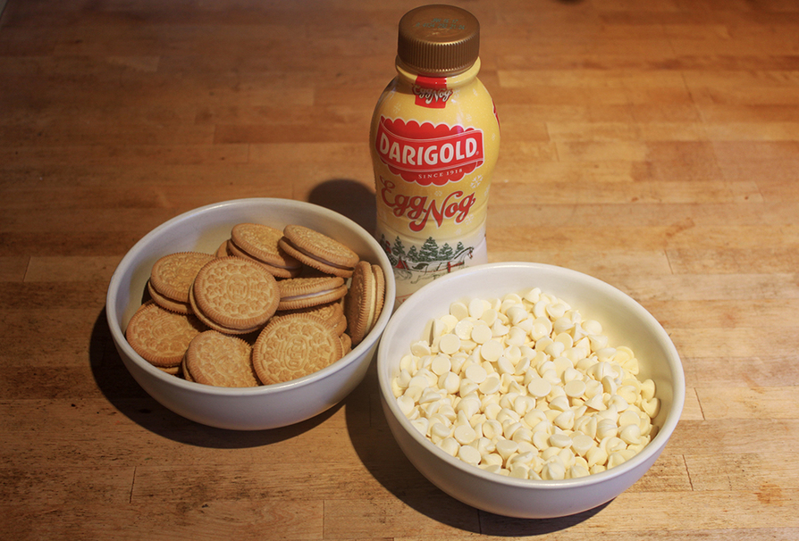 Microwave 1 cup of white chocolate chips with eggnog for a minute and a half, stirring at 30 second intervals. Add the crushed cookies to the bowl.