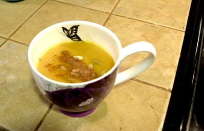 While the butternut squash is roasting, dice the onion and apples, and saute them over medium-high heat in the coconut oil. Add the curry powder and sauté until softened.