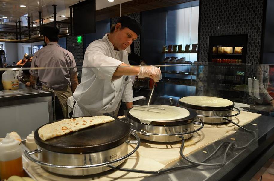 The pop-up restaurant is sleek and surprising – you’ll have to wander through to find out exactly what will be there any given day. Recently, a Mexican station has been up and running during lunch.