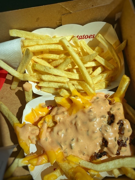 Still sitting in my paper tray was the box of potato french fries absolutely drenched in a mix of special sauce, which can only be described as a mix of mayonnaise and ketchup, and grilled onions. The strawberry milkshake was the ideal way to wash the rest of the dairy and meat down, tasting just like the powdered strawberry Nesquik of my childhood and the creamiest of ice creams.