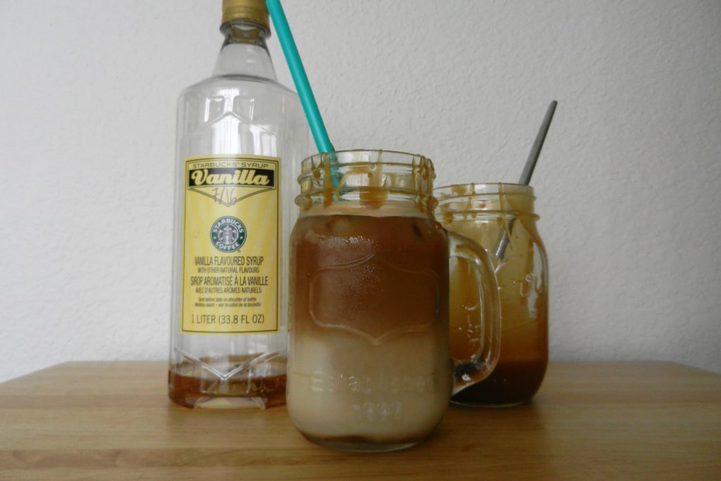 STEP 1: Add vanilla syrup into your cup or glass. I used Starbucks brand vanilla syrup, which you can get for around $12 for a one-liter bottle. You can get it from any Starbucks store, as long as the store has enough on hand to spare one. Otherwise, you can use any vanilla flavored coffee syrup