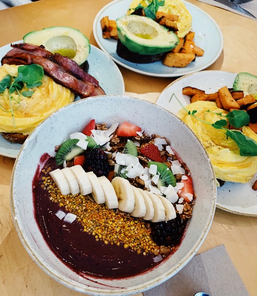 Two Hands is an Australian inspired cafe with an attractive, coastal aesthetic and food to match the vibe. The “Build Your Breakfast” was a best-seller amongst my group of friends. This dish (pictured) includes two eggs (any style) on sourdough toast with sides including bacon, sweet potato, and pickled beets. If you are eating completely plant-based, I recommend the smashed avocado toast or the açaí bowl loaded with toppings such as granola, bee pollen, coconut flakes, toasted pepitas, and fruit. The chocolate chia pudding with house-whipped peanut butter and chocolate avocado ganache is also gluten and dairy free. Make sure to add an order of the “my way” smoothie packed with banana, blueberries, açaí, cacao, and almond milk to help kick-start your day.