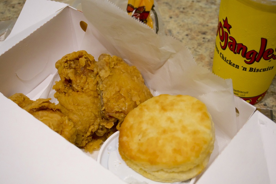 The Bojangles’ franchise is particularly popular in the Carolinas, with 448 locations between the two. The chicken ‘n biscuits fast food restaurant has a cult following in that region of the South East, but is relatively famous throughout the entire East Coast. To acquire a complete flavor profile for Bojangles’, I ordered a four piece dinner, which includes a leg, two thighs, and a biscuit. While the actual fried chicken was my intention for testing, the sides, or fixins, offered include Bo-Tato rounds, Bojangles’ cajun pintos, Bojangles’ dirty rice, coleslaw, green beans, macaroni and cheese, mashed potatoes ‘n gravy, and seasoned fries.