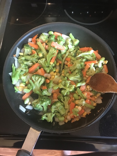 Add the onion and frozen vegetables and cook on medium-high heat for 3-5 minutes, stirring continuously.