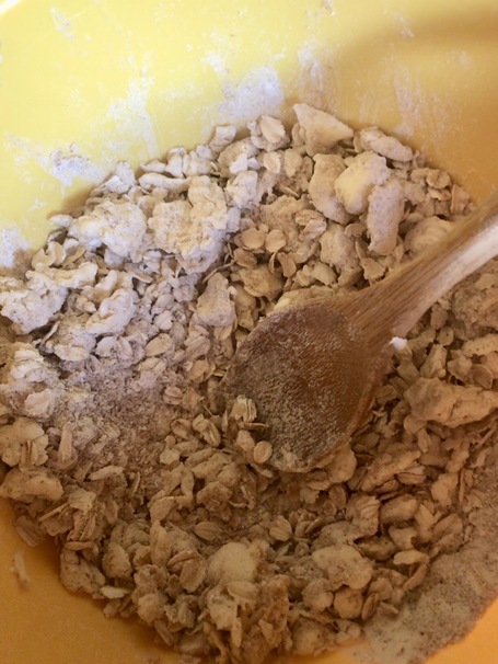 To prepare the topping, mix the brown sugar, flour, oats, and cinnamon in a bowl. Then, grate the cold butter into the mixture and mix well until it’s crumbly.