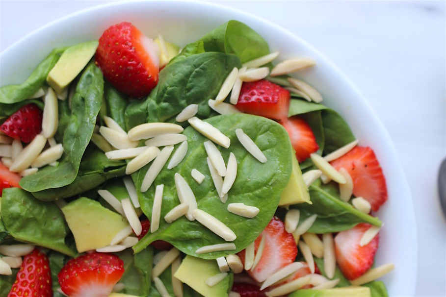 Slice the avocado and strawberries, and add them, along with the slivered almonds, to your salad.