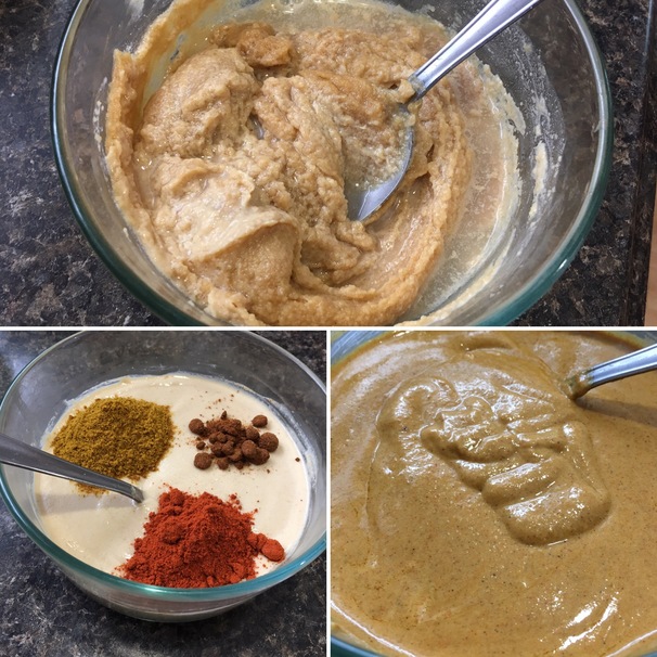 Make the tahini sauce: Scoop the tahini into a bowl and mix if the oil is separated from the paste. Squeeze in the lemon, making sure that the seeds do not make their way into the tahini. Mix until thick, then add water until the mixture is viscous. Add spices and mix again before adding all other ingredients. Add hot water and stir until the sauce is thick enough to stick to the top of the towers, but thin enough to cascade slightly over the sides.