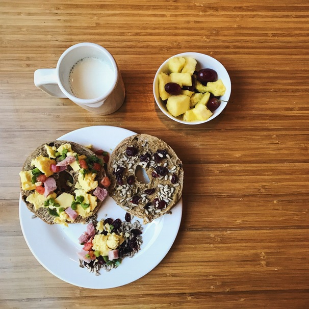 Bagel with sunflower butter and raisin, bagel with fried egg and vegetables, with side fruit mix. Skim milk for drink.
