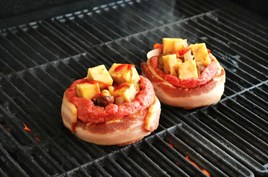These burgers get their shape from a good ol’ can of beer. The moist meat of the burger is enveloped in a crispy hug of delicious, bacon. You can stuff the burger with any eggs or veggies that your heart desires.