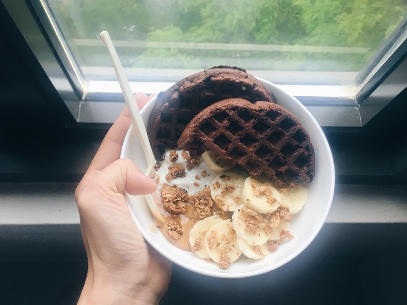 4. Toppings: One protein waffle, slices of banana, greek yogurt, peanut butter, and sprinkle of granola.