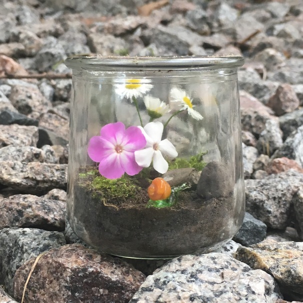Get your kids, nieces/nephews or siblings away from their electronics and out into the sunshine with a fun faux terrarium project. Gather flowers, rocks, moss and more to create an environment that any fairy or (glass) snail would love to live in.