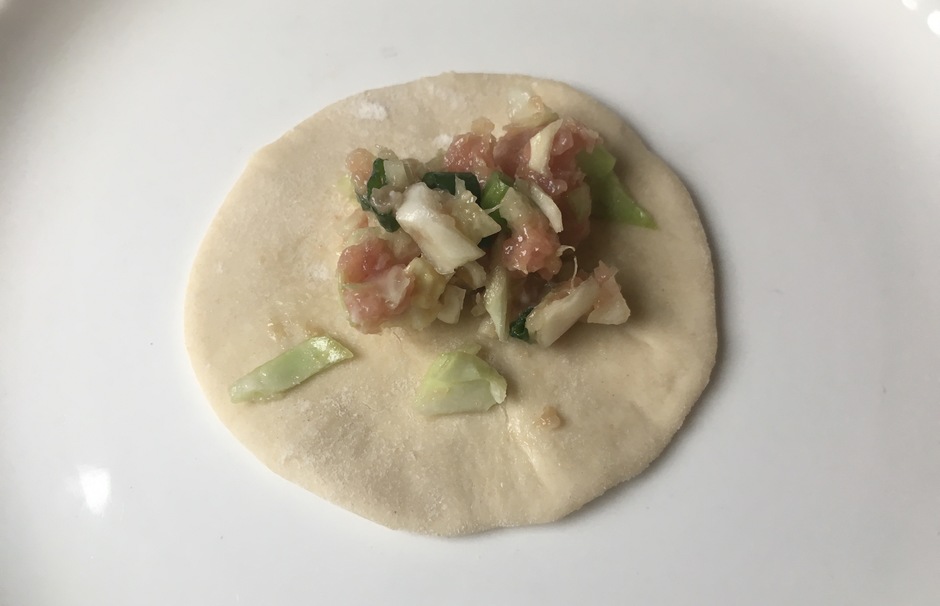 Take a spoonful of the gyoza filling, and place it in the middle of the gyoza skin. Make sure to not overfill the dough.