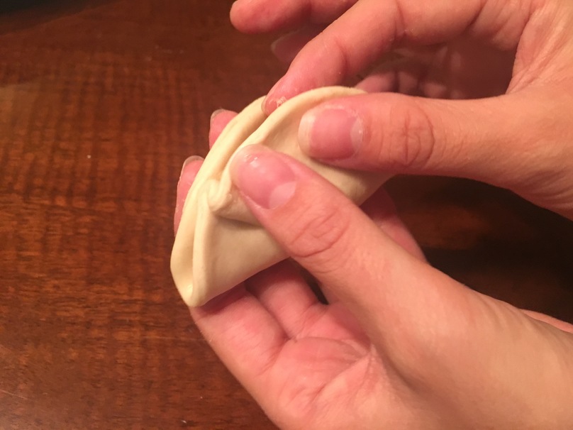 Wet one half of the ridge of the gyoza skin with fingertip. Not too much, just a little.