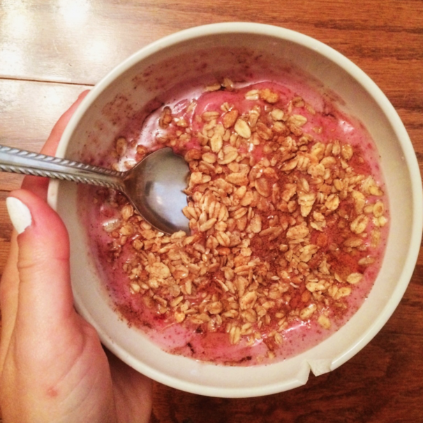 Obviously, the only thing that would make this super fruit-filled bowl even better is ice cream. For this one, I blended açaí powder with the tropical mango Brio ice cream, a banana, and frozen berries. I then topped it off with granola, cinnamon, and some agave nectar. This bowl was magically delicious (100 times better than a bowl of Lucky Charms). The consistency was super creamy and all the fruits blended together perfectly to create a yummy flavor. With this bowl as you’re breakfast, I’m sure you’ll be ready for anything.