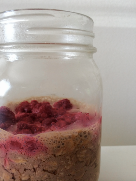 This was perhaps my most experimental (and somewhat risky) breakfast. I melted down a 1/2 cup of Brio dark chocolate ice cream, mixed it with a 1/2 cup hot coffee, and added both to a mason jar filled with a cup of old fashioned oats. I then topped it off with about a 1/2 cup of frozen raspberries, then mixed everything together. Melting the ice cream to use as the liquid base for these overnights oats made me somewhat uncertain, but I figured it was worth a try.