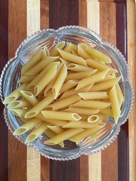 Bring 4 cups of water to a boil. Place 1 box of your favorite pasta in the water and reduce the heat. Drain the noodles in a strainer. My favorite is farfalle or penne!