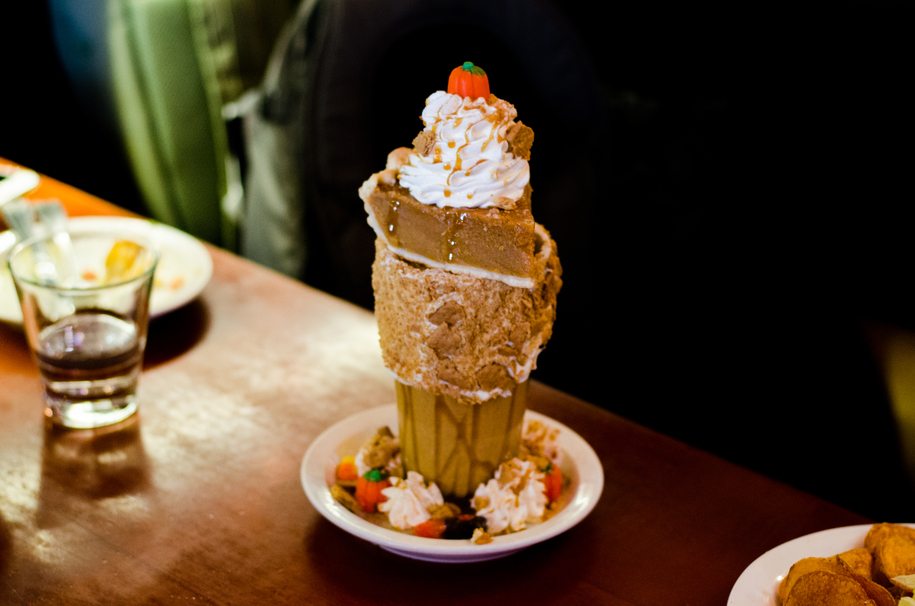 Served in a tall glass coated in frosting and graham crackers, the frappe included a handful of seasonal appropriate candy and was topped with an entire slice of pumpkin pie. As for the frappe itself, it tasted like a light, yet creamy milkshake.