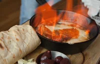 Yep, you read that right. The flames crisp up the outside of the cheese and make it an excellent dip for an appetizer or snack.
