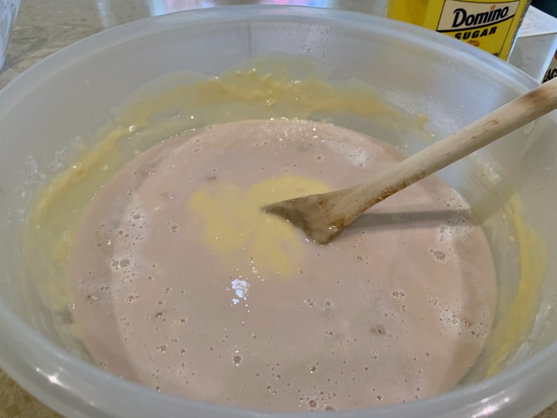 Add the remainder of your flour slowly. (Subtract the number of cups you added previously from 5 to get the number to add here). Add cup by cup. By the last cup, you may want to put some flour on the countertop and put the batter on top; then, you can need the last cup of flour into the dough.