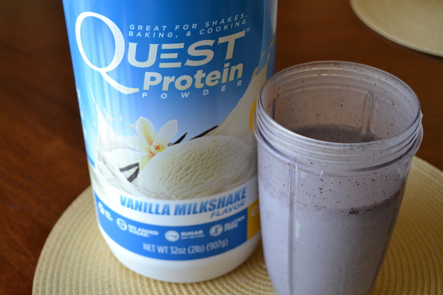 All this one takes is some protein powder, almond milk, blueberries, peanut butter and ice.