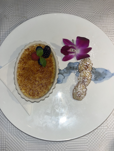 To top off our meal, we opted for the crème brûlée dessert. The dish came within a smokey, caramelized crust with berries on top and madeleine cookies dusted with powdered sugar on the side.