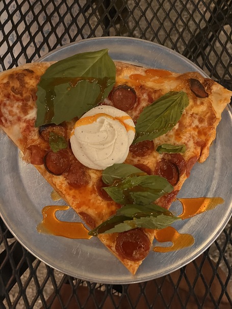I was most excited to try the $7 IYKYK slice that didn’t have a menu description at all. Based on the name and price, I was expecting something extravagant and unique, so I was a little disappointed when we received a slice almost identical to the Borgata. From my guesstimation, this slice had red sauce, pepperoni cups, mozzarella, burrata, fresh cracked pepper and some kind of chili sauce on top. This slice was definitely the best tasting out of all the ones we ordered, but it just wasn’t what I was expecting.
